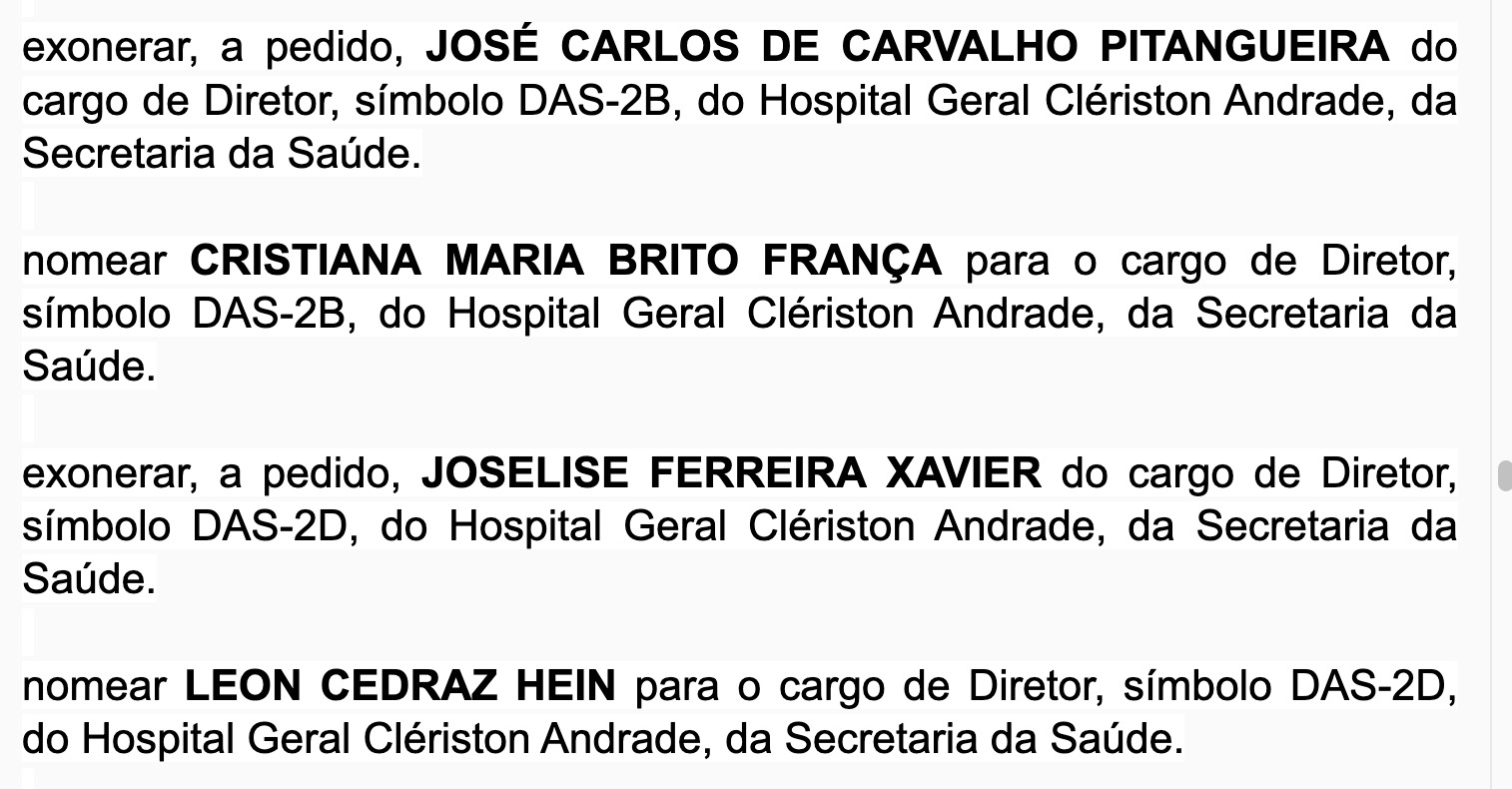Já a diretoria administrativa do HGCA passa a ser chefiada a partir deste sábado por Leon Cedraz Hein em substituição a Joselise Xavier. O diretor médico permanece Karlos da Silva Figueiredo. Veja abaixo como ficou a diretoria