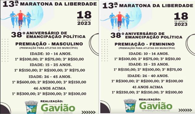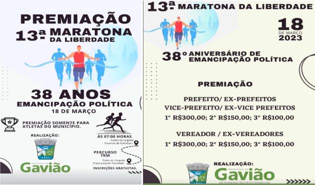 A 13ª Maratona da Liberdade de Gavião, está marcada para o próximo dia 18, as 07h, tendo 7KM de percurso, com a chegada na Praça Joaquim Pantaleão, em comemoração aos 38 anos de Emancipação Política do município.