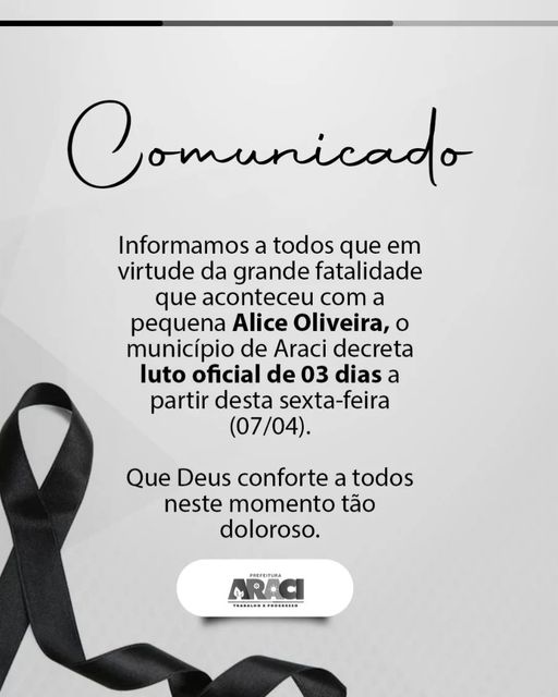 A Prefeitura divulgou em redes sociais um card falando do desaparecimento da menor e posteriormente a nota de pesar pelo desfecho trágico e na oportunidade anunciou o cancelamento dos festejos.