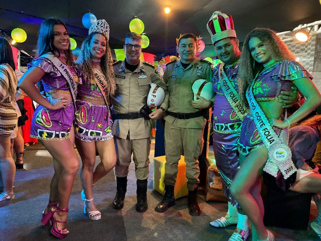 Tenente-coronel Müller comandante do 16ºBPM e capitão Charles ao lado das princesas, rainha e Rei Momo