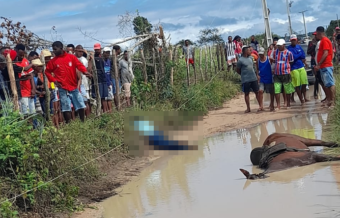 Na manhã deste domingo (23), por volta das 07h30, aconteceu uma tragédia na zona rural de Irará, município do Portal do Sertão quando um homem e um cavalo morreram numa estrada vicinal da Fazenda Espinho, ao passar por uma poça d’água, onde havia um fio da rede de alta tensão arriado. Os dois foram arremessados ao solo e morreram na hora. As informações são do Blog do Tavares.