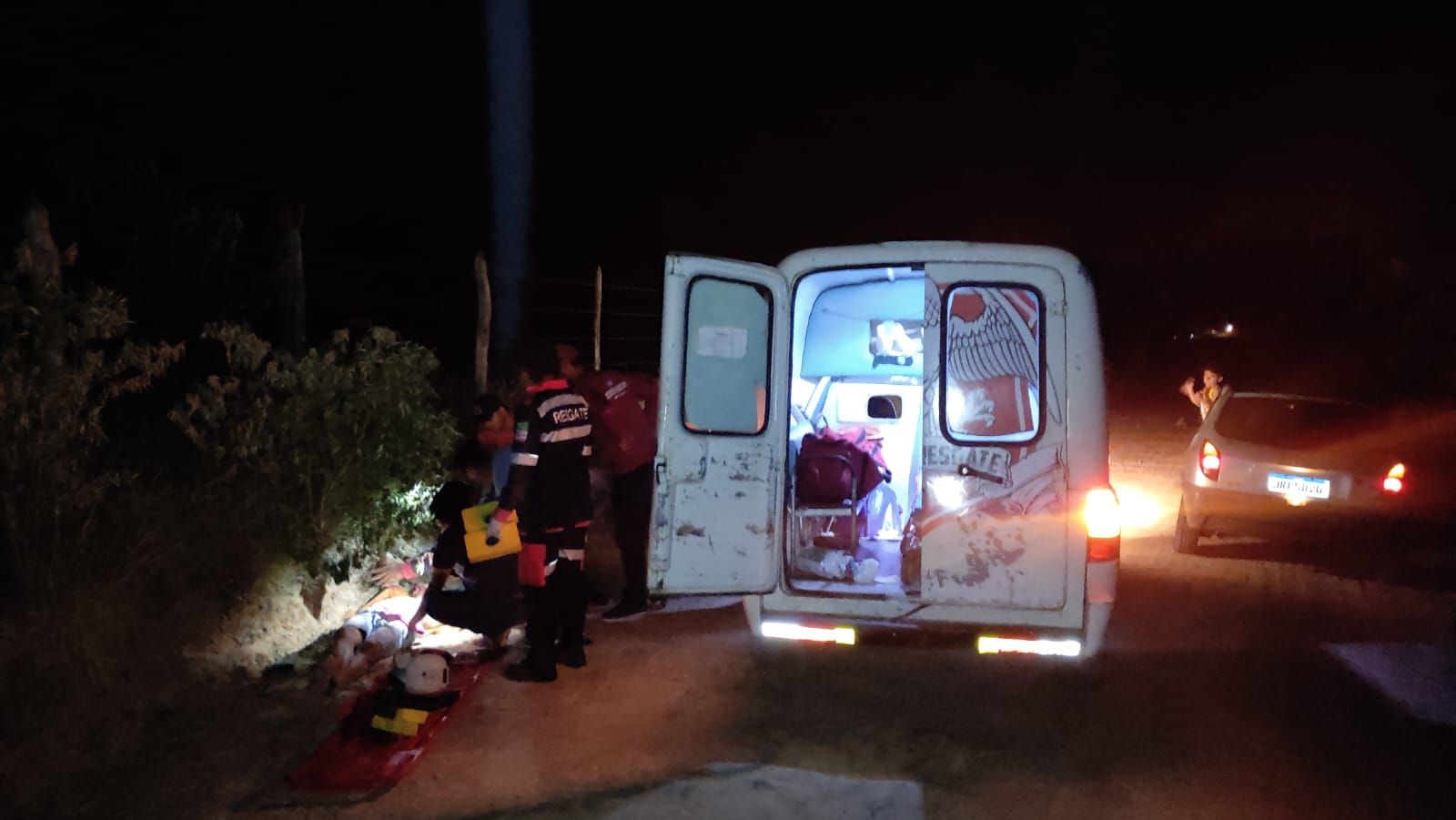 A equipe do Águia Resgate foi acionada e ao chegar no local encontrou a vítima consciente, porém desorientada, com suspeita de TCE (Traumatismo Craniano Encefalico), suspeita de fratura na clavicula esquerda, corte profundo na mandibula, perfuração profunda na coxa esquerda e muitas escoriações pelo corpo.