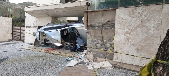 Imagens feitas por uma equipe da TV Globo mostram o carro virado na frente do prédio, que ficou danificada. É possível observar que havia sangue no chão. Pedaços do veículos ficaram espalhados pela área.