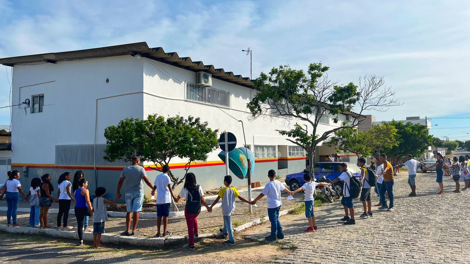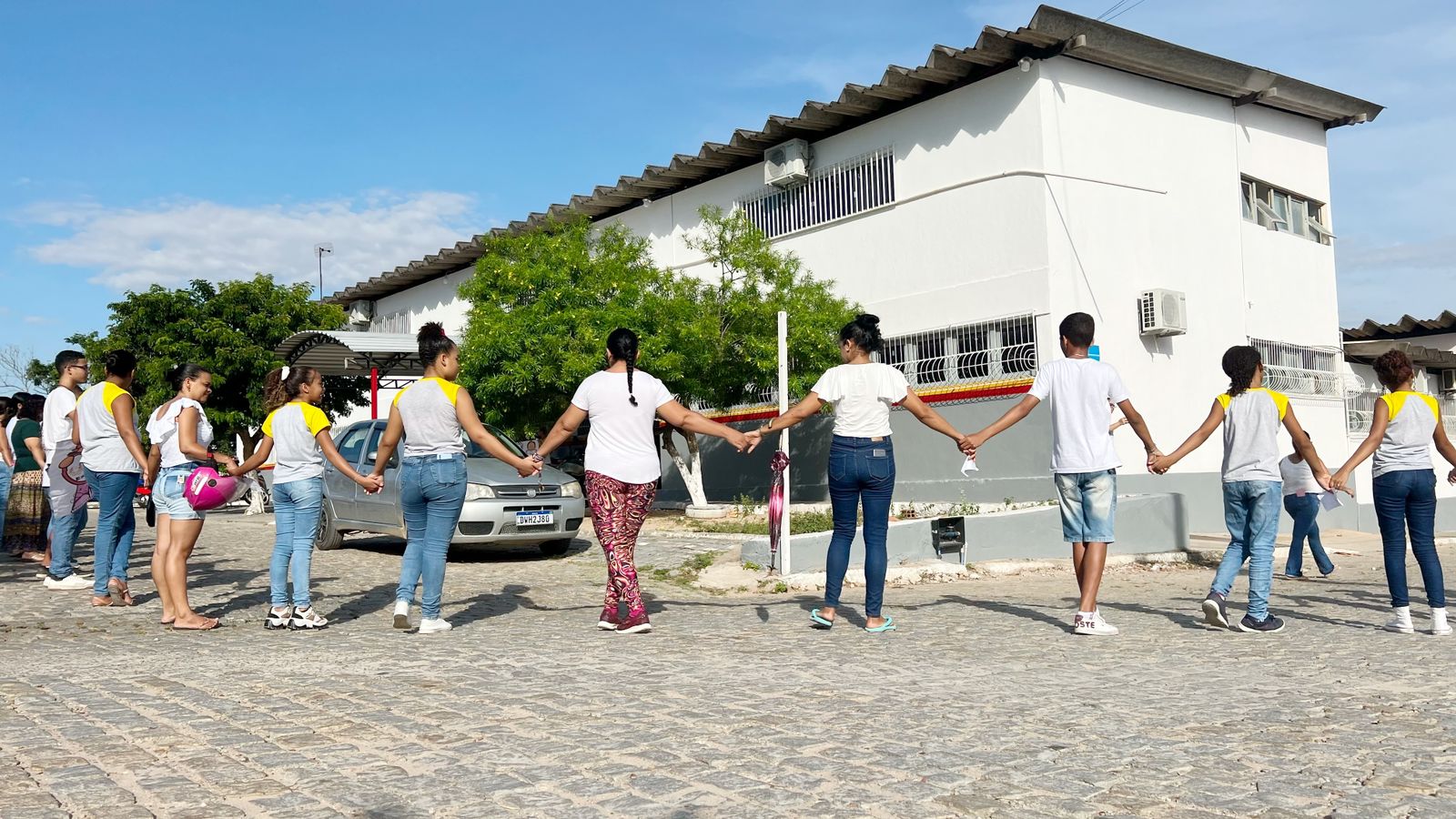 Na manhã desta quinta-feira (20), a escola reuniu alunos, pais, responsáveis e todo corpo administrativo para um abraço em grupo, para demonstrar simpatia e apoio mútuo.