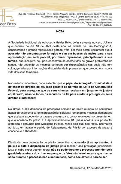 O Escritório de Advocacia que atua na defesa do acusado divulgou uma nota à qual nega que ele tenha fugido – Leia abaixo a justificativa