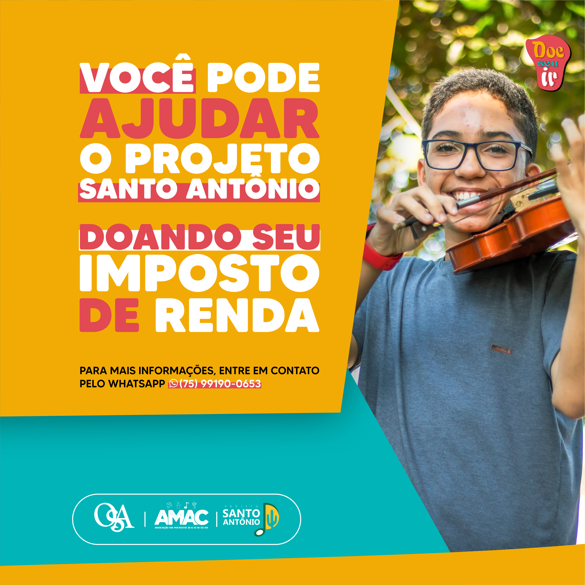 Portanto, de qualquer lugar do Brasil, se você ainda vai realizar a sua declaração, fale com seu contador e faça uma doação de parte do imposto que você tem a pagar. Até o dia 31 de maio de 2023 você pode contribuir diretamente com a Orquestra Santo Antônio, na cidade de Conceição do Coité, sem nenhum custo e ajudar a transformar vidas.