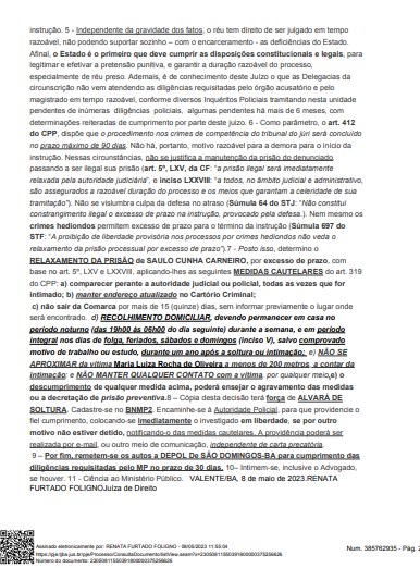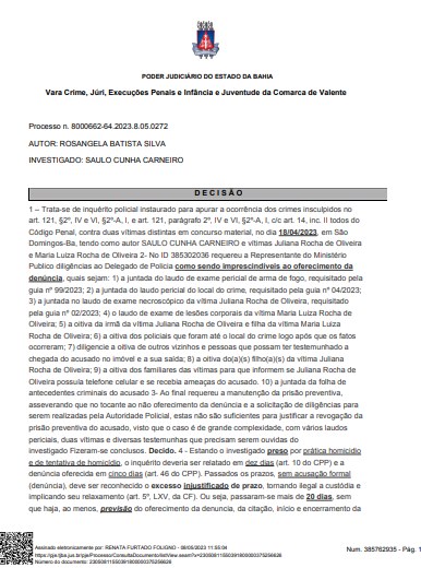 De acordo com o documento que nossa redação teve acesso, expedido pela Vara Crime, Juri, Execuções Penais, e Infância e Juventude da Comarca de Valente, traz uma decisão da juíza titular Renata Furtado Foligno, pelo relaxamento de prisão do autor, anteriormente pedido pela delegada Rosângela Batista Silva.