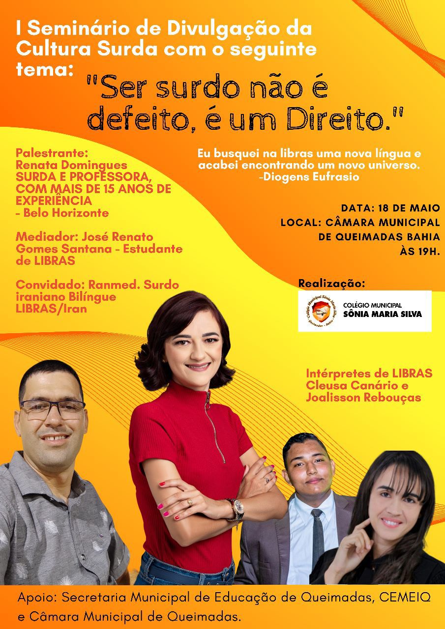 Com objetivo de proporcionar uma reflexão sobre o direito de ser surdo e abrir caminhos para o ensino de LIBRAS- Língua Brasileira de Sinais no município, acontecerá na próxima quinta-feira, dia 18, a partir das 19h na Câmara de Vereadores de Queimadas o I Seminário de Divulgação da Cultura Surda.
