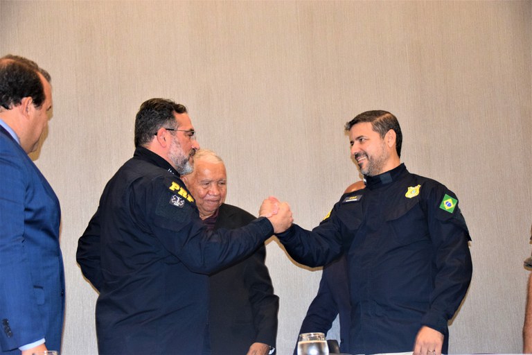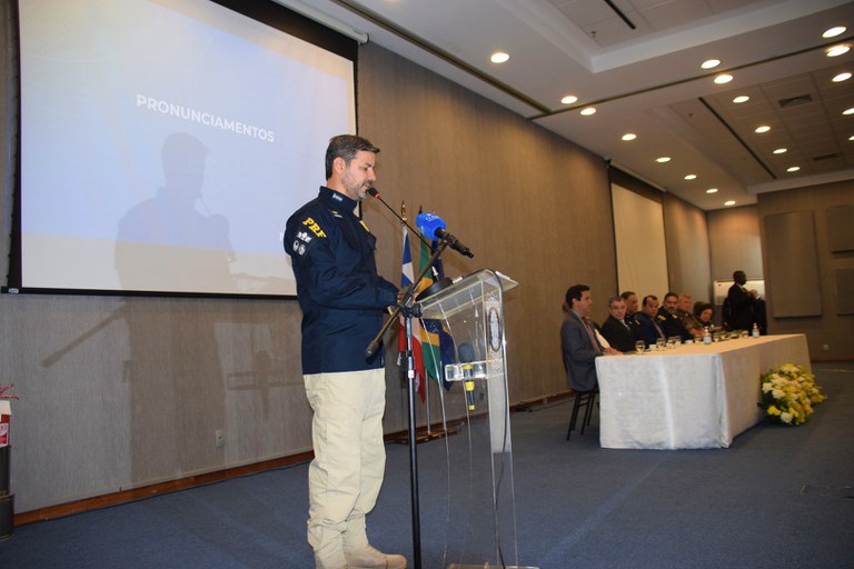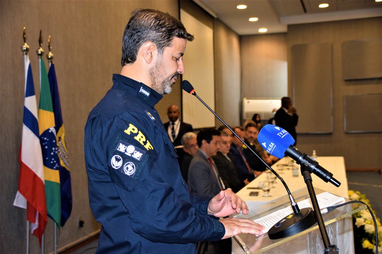 O diretor-geral, Fernando Oliveira, iniciou a fala bastante emocionado e disse do prazer que sentia por ‘pisar’ em solo baiano. Parabenizou o empossado e destacou a relevância da PRF BA, que possui uma das maiores malhas viárias do país e tem muita representatividade no cenário nacional, haja vista sua importância estratégica que se destaca pelos resultados expressivos nas ações de combate à criminalidade e também no volume de fiscalização de trânsito, promovendo a segurança e tranquilidade aos usuários que trafegam pelas vias. Agradeceu a presença das forças de segurança e instituições parceiras. Disse que vai continuar trabalhando na valorização do servidor e para trazer mais investimentos para a segurança pública. Por fim, falou sobre a importância do compromisso de todos os policiais e demais servidores na entrega de serviços de qualidade e no atendimento à população, que diariamente necessita dos serviços da instituição.