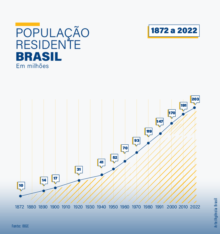 O Censo 2022 mostra que a população do Brasil atingiu 203.062.512 pessoas, com aumento de 12,3 milhões desde a última coleta, feita para o Censo 2010. Os dados foram divulgados nesta quarta-feira (28) pelo Instituto Brasileiro de Geografia e Estatística (IBGE). A diferença, de 6,5%, significa que o crescimento médio da população nos últimos anos foi de 0,52%, o menor registrado no país desde 1872, quando foi realizado o primeiro censo do país.