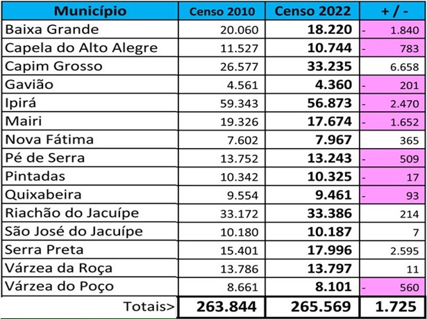 O maior crescimento populacional foi registrado em Capim Grosso, o município registrou 6.658 moradores a mais que 2010, seguido por Serra Preta com 2.595.