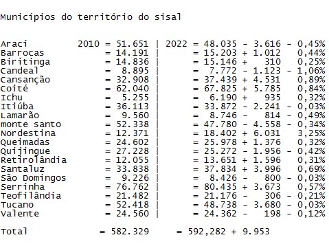 O cresimento populacional no território do sisal foi pequeno apenas 9.953 habitantes o que representa cerca de 1,7%.