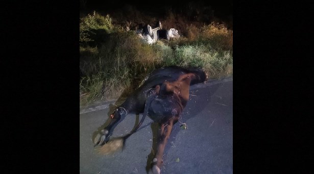 Não temos informações do horário exato do acidente que envolveu uma caminhonete Toyota Hilux e uma vaca. O veículo atingiu o animal, saiu da pista e capotou.
