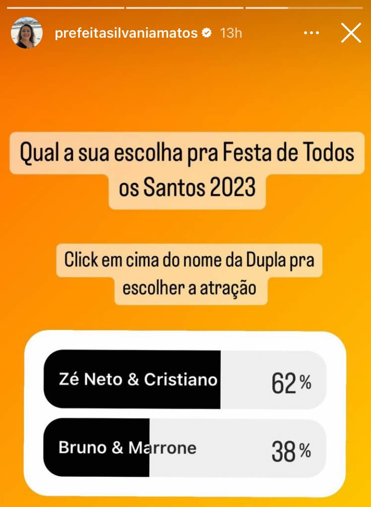 A prefeita do município de Monte Santo, no território do sisal, Silvania Matos (PSB) publicou no último sábado, 15, em seu Instagram uma enquete perguntado a preferência do público entre duas grandes atrações para a Festa de Todos os Santos que acontece entre o fim de outubro de inicio de novembro, entre Zé Neto & Cristiano e Bruno & Marrone.