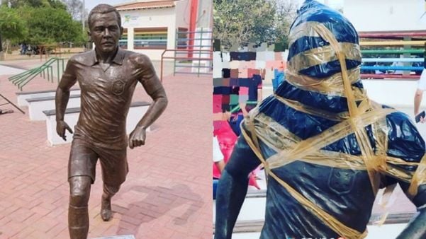 A estátua em homenagem ao jogador Daniel Alves foi vandalizada em Juazeiro, no norte da Bahia, nesta quinta-feira (7). Uma sacola plástica e fitas adesivas foram colocadas na cabeça da escultura. As informações são do site Correio.