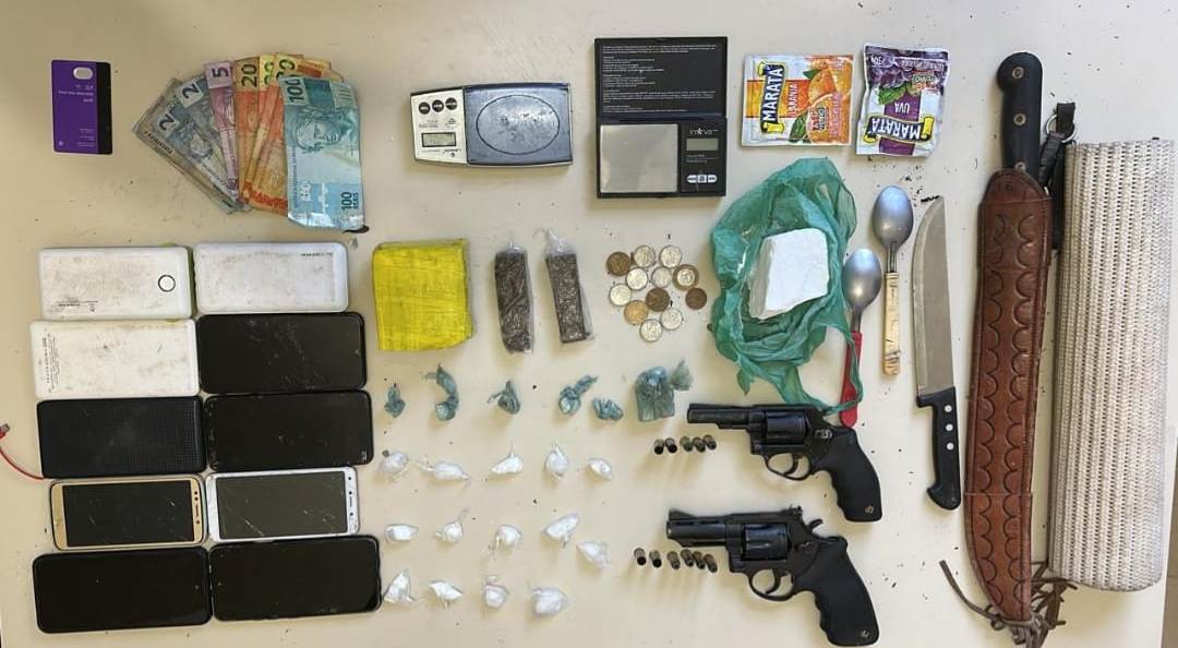 A PM informou que armas de fogo, munições, faca, facão, balanças de precisão, celulares e porções de maconha e cocaína foram apreendidos durante a ação. A ocorrência foi encaminhada à Polícia Civil.