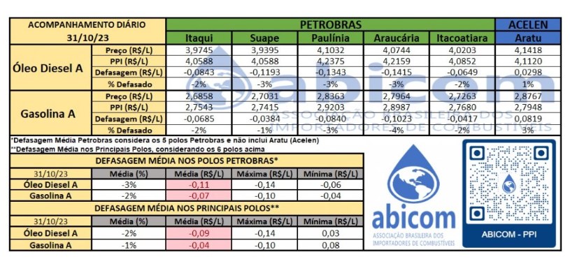 Já a Abicom informou que seu relatório leva em consideração a “estabilidade no câmbio e a redução nos preços de referência do óleo diesel e, principalmente, no da gasolina no mercado internacional no fechamento de ontem, o cenário médio de preços aproxima-se da paridade para o óleo diesel e para a gasolina”.