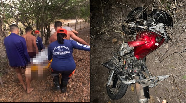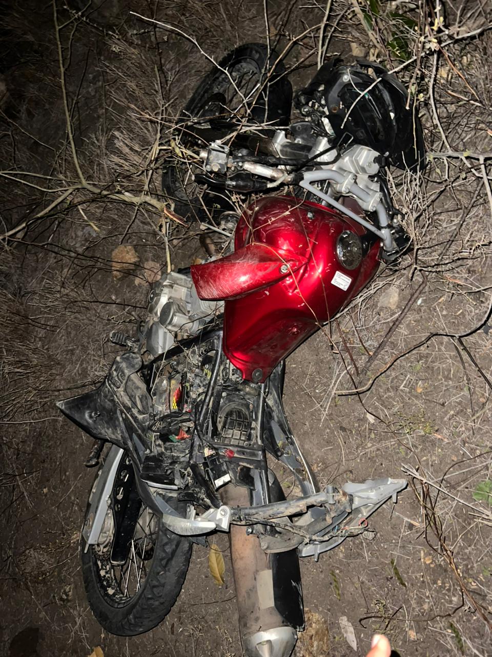 Uma motocicleta foi encontrada parcialmente destruida dentro do matagal ao lado da pista e dois homens caídos com ferimentos graves, suspeita de Traumatismo Craniano Encefalico (TCE).