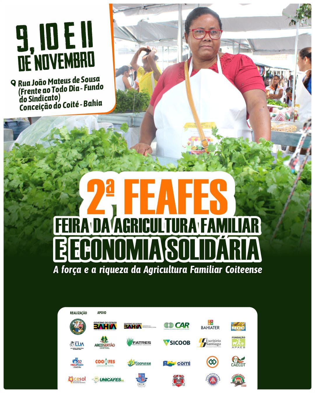 A II Feira da Agricultura Familiar e Economia Solidária – FEAFES é uma iniciativa do Sindicato dos Trabalhadores da Agricultura Familiar – SINTRAF de Conceição do Coité e parceiros, e pretende mobilizar cerca de 200 agricultores e agricultoras individuais e de grupos de produção das comunidades rurais coiteenses e da região para expor e comercializar suas produções durante os três dias de evento que contará com exposições, feira da saúde, oficinas temáticas e manifestações culturais.