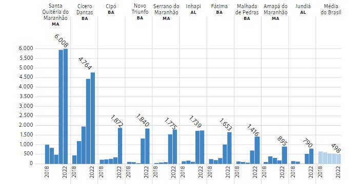 Segundo o levantamento, foram identificadas 108 cidades que tiveram grande variação na quantidade de matrículas no programa de 2021 a 2022 e que informaram ter mais de 10% da sua população na modalidade.