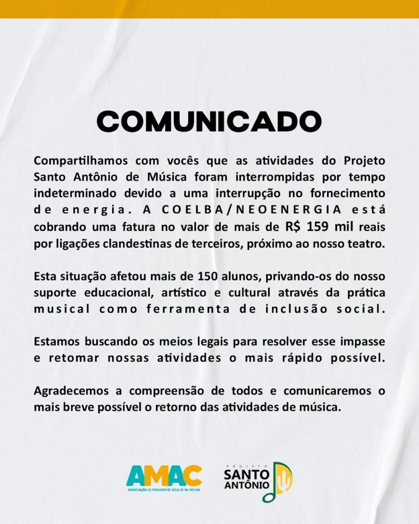 Segundo o maestro Josevaldo Nim a empresa energética apresentou uma conta de liuz no valor de R$ 159 mil, que segundo ele proveniente de ligações clandestinas popularmente conhecida por “gato” através de terceiros.