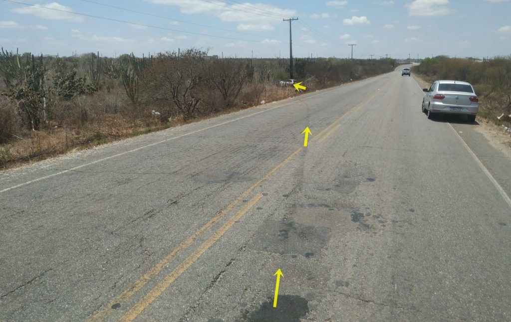 Conforme as imagens e vídeo abaixo mostram uma frenagem que comprova que o carro seguia no sentido Conceição do Coité e após uma curva suave a marca de pneus cruza a pista e os dois veículos param um ao lado do outro, enquanto os corpos ficaram cerca de 20 metros de distância.