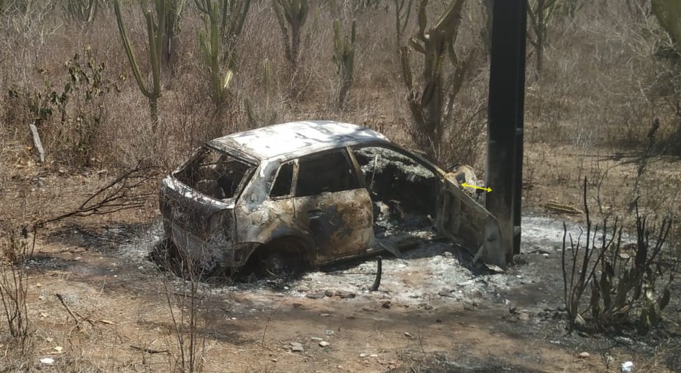 Observa-se também que o incêndio que consumiu o carro não foi em consequência da colisão com o poste, faltou pouco centimetros, mas não atingiu.
