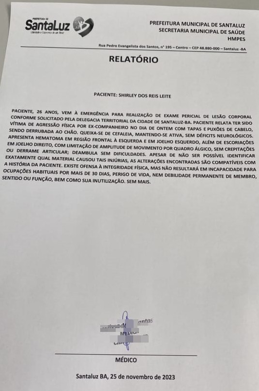 Ainda segundo Shirley, André estava apenas de sunga de banho ou cueca, ela não soube distinguir. Ainda na madrugada ela deu entrada no Hospital Municipal de Santaluz onde foi atendida, conforme relatório médico abaixo.