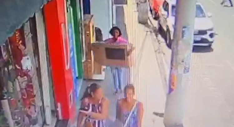 Em vídeos, é possível perceber a mulher ao lado de algumas caixas de TV enquanto outra se movimenta como tivesse orientando o momento certo para a outra pegar a caixa, até que isso acontece, ambas saem do estabelecimento caminhando pela calçada.