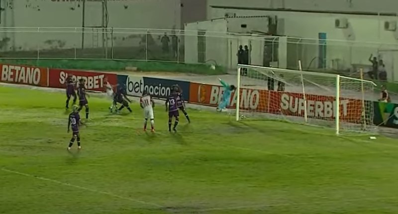 Cruzamento na area por volta dos 10 minutos, houve um cabeceio que passou raspando a parte alta da trave esquerda e o goeiro Marcelo só acompanhou com os olhos, pois nao tinha tempo de chegar.