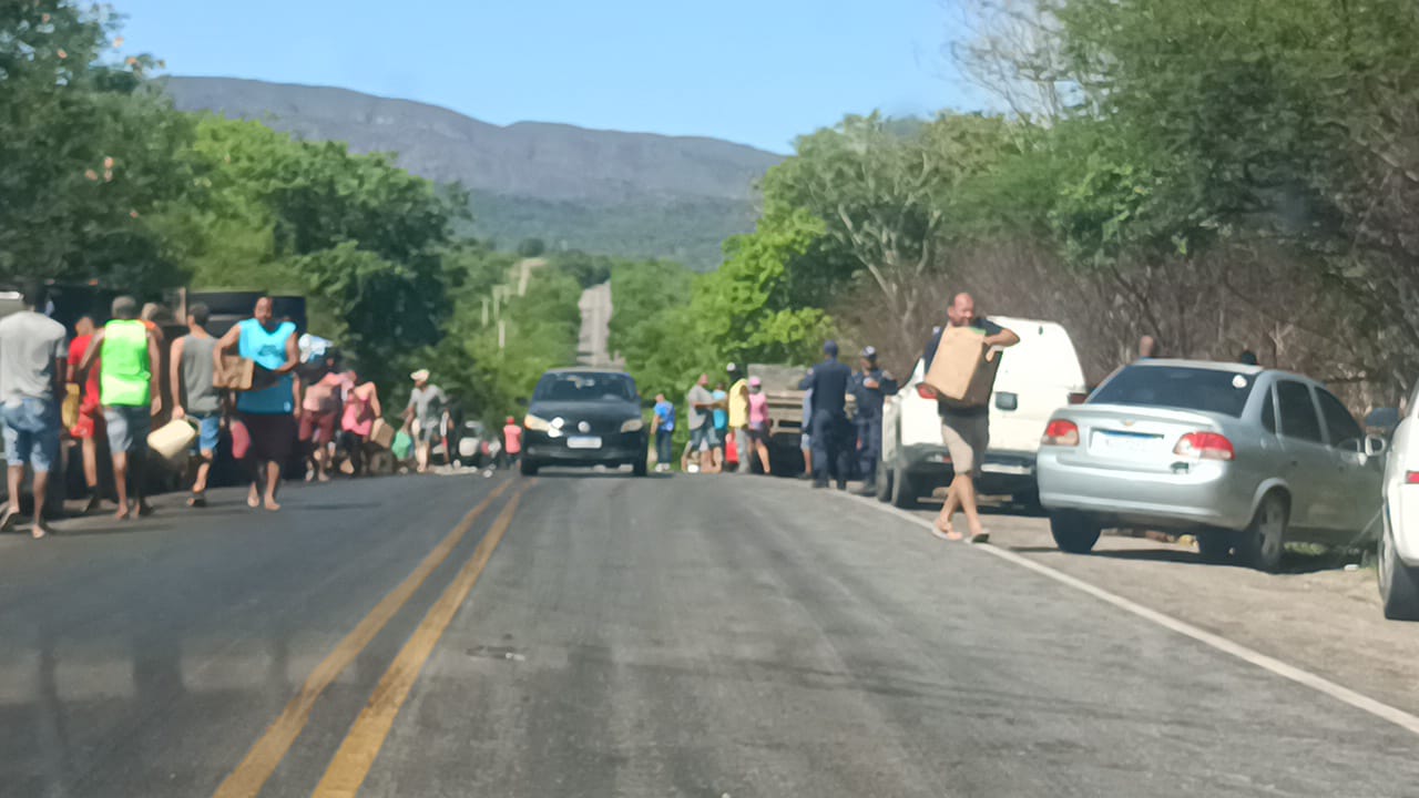 Parte da carga, que é segurada, já foi levada por pessoas que passaram pelo local.
