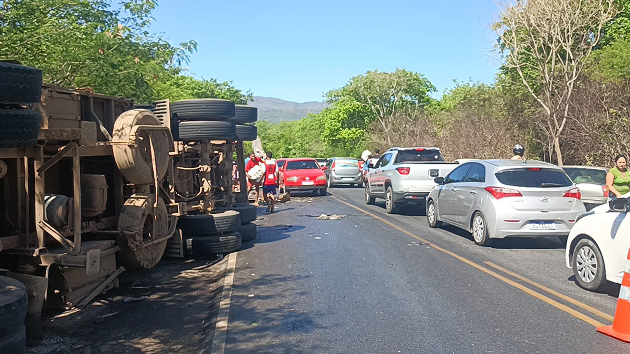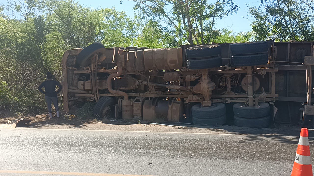 Uma carreta bitrem tombou na manhã deste domingo 14/1, na br-324, próximo ao contorno de Caem, há cerca de 10 km do município de Jacobina.