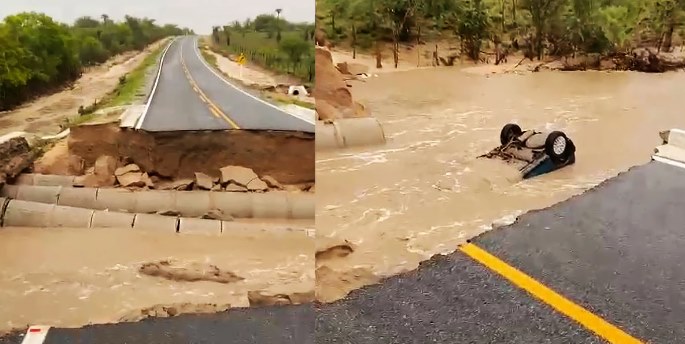Carro capota e cai em cratera aberta na BA-220 pelas fortes chuvas