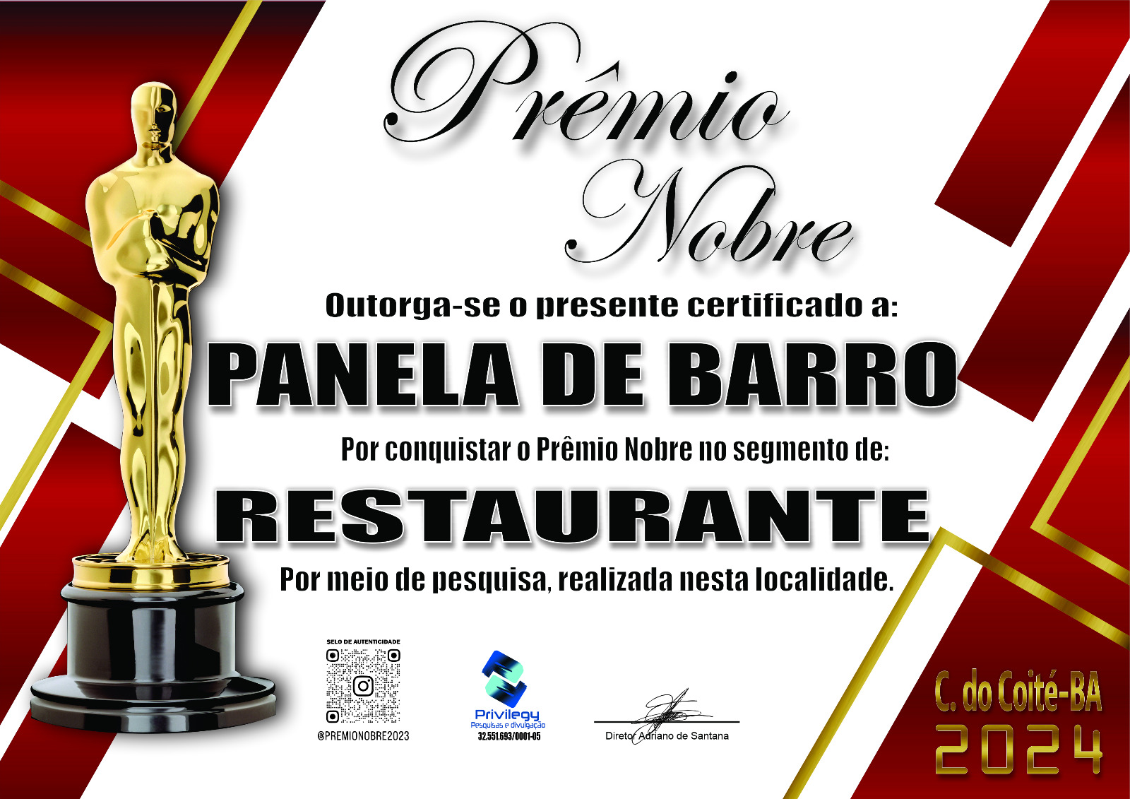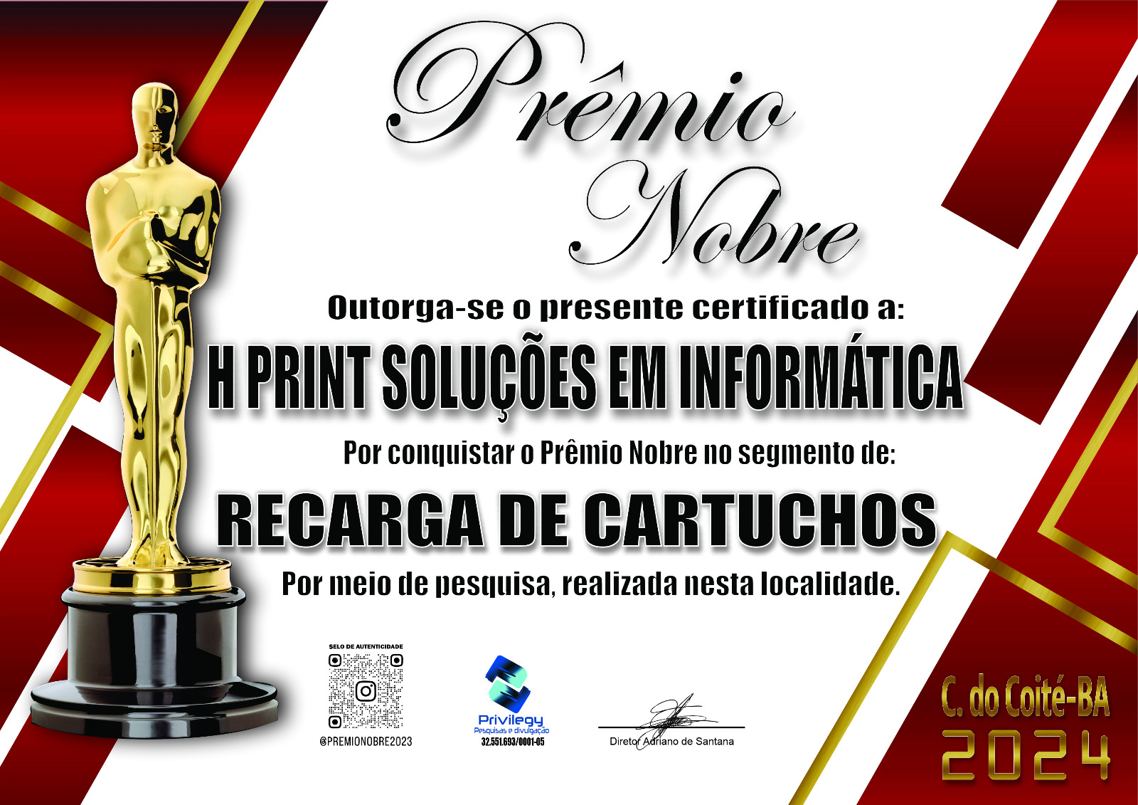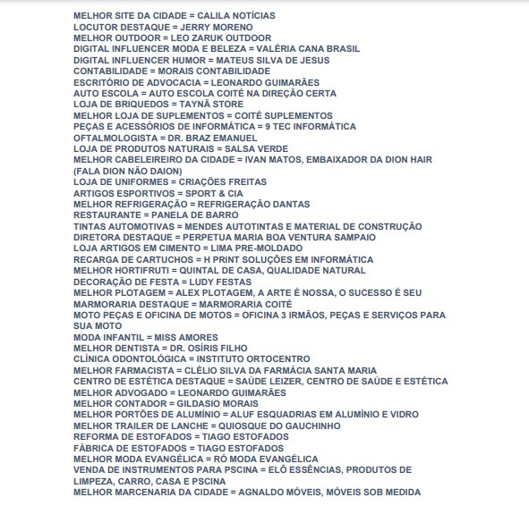 A Privilegy, empresa que atua no segmento de pesquisas, divulgou os vencedores do Prêmio Nobre 2024 de Conceição do Coité. O prêmio apresenta as empresas e os profissionais que mais se destacam em atendimento, preço, qualidade e profissionalismo de acordo com pesquisa popular realizada em Conceição do Coité no mês de Dezembro e Janeiro de 2024.