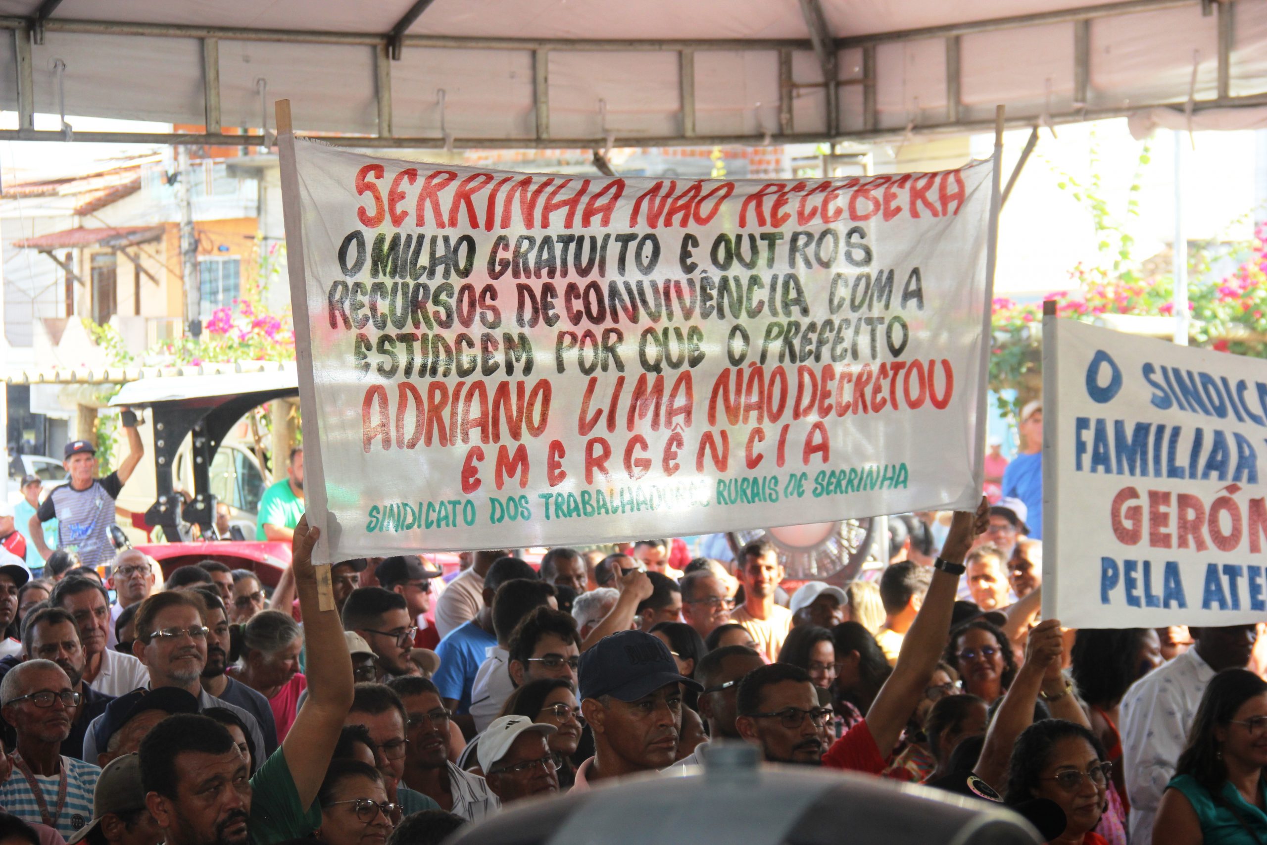 Além de Marcelo Araújo que é do União Brasil, o prefeito de Serrinha Adriano Lima (PP) também não decretou situação de emergência e vai ficar de fora dos benefícios do Governo. Um grupo levou uma faixa protestando a não participação neste programa que beneficia diretamente o pequeno produtor rural.