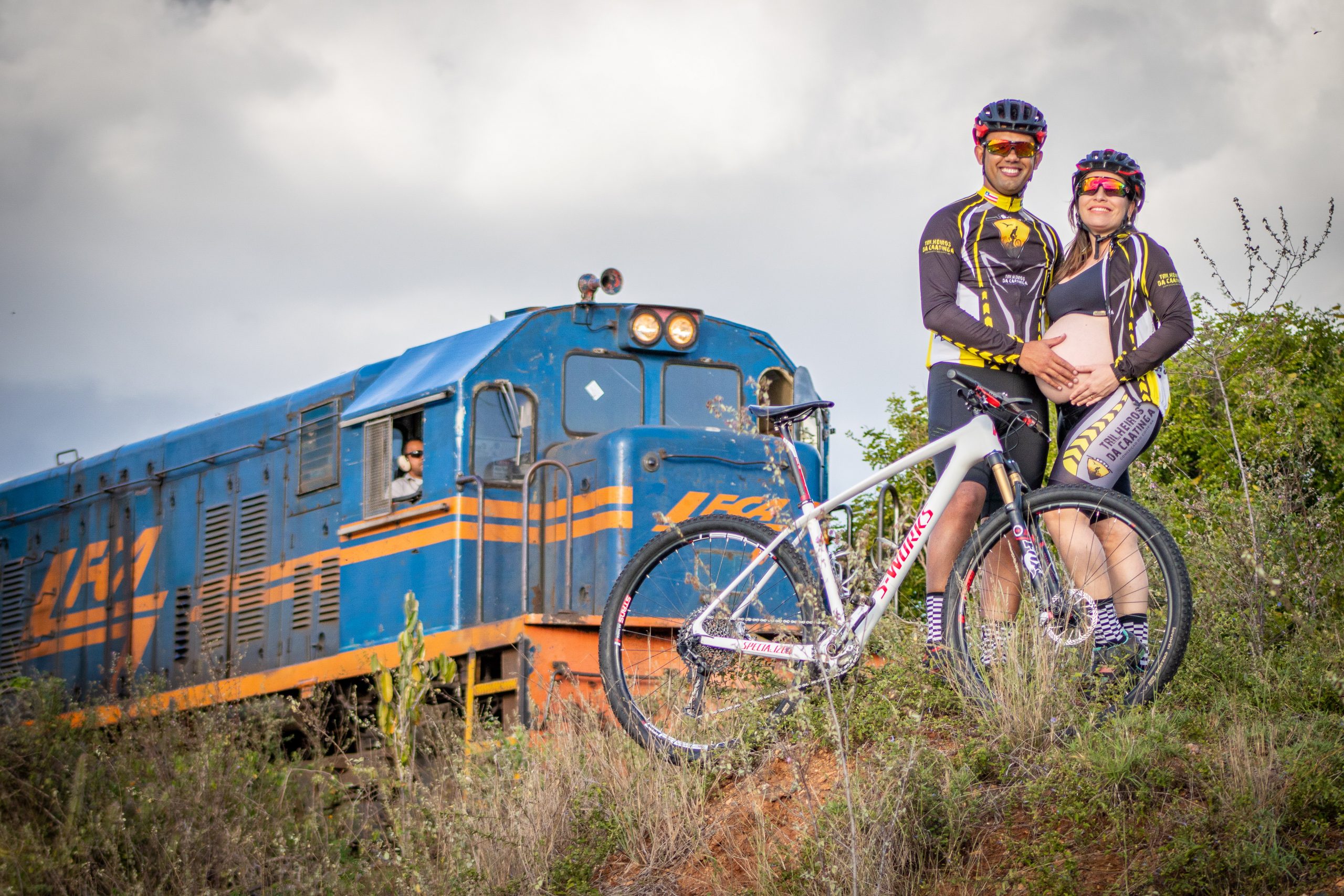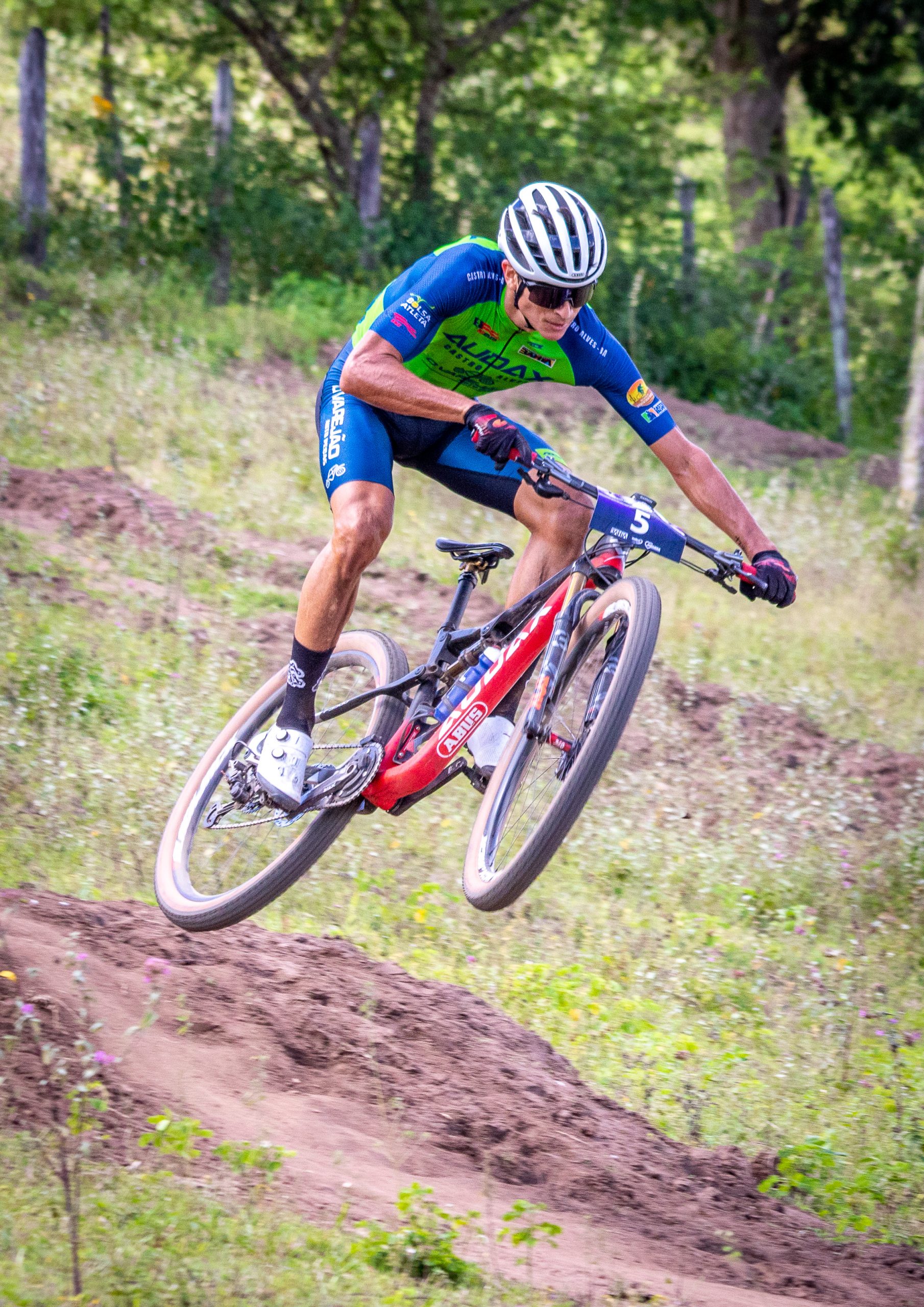 Dinamismo e paixão: Um ciclista em plena corrida de mountain bike, seu esforço e foco capturados em uma estrada de terra, refletindo a energia vibrante do esporte.