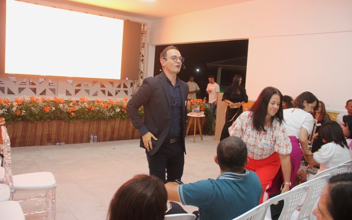 Sérgio Shell veio diretamente de Vitória da Conquista para fazer uma palestra nesta Jornada Pedagógica. Ele que é consultor organizacional, educador, palestrante, coach formado pela Associação Internacional de Coaching Instituto e Sociedade Latino Americana de Coaching, especialista em Gestão e Desenvolvimento de Seres Humanos, administrador de Empresas pela FTC de Vitória da Conquista entre outros itens curriculares, iniciou seu trabalho quando os participantes já estavam há mais de duas horas sentados e ele logo envolveu toda plateia.