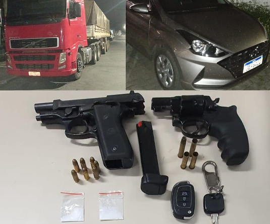 Os policiais conseguiram recuperar a carreta Scania, carregada com ração animal e o veículo HB20. Também apreenderam uma pistola Taurus, calibre 380; um revólver calibre 38; dois papelotes de cocaína; e dois celulares. Não há informação sobre quem estava conduzindo a carreta.