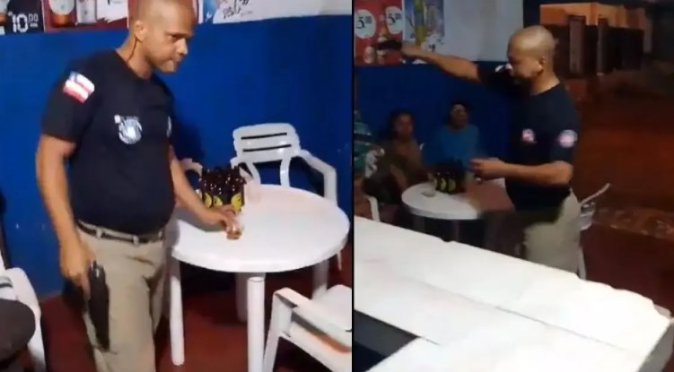 Do lado, em uma mesa, uma mulher o questiona sobre o porquê de ele estar bebendo, ao que o PM a agride com uma tapa no rosto. A mulher, então, arremessa uma garrafa que atinge a cabeça do policial.
