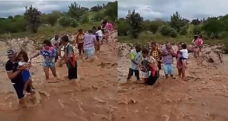 Homens, mulheres, adolescentes e crianças se arriscaram no fim da manhã desta segunda-feira, 04, quando enfrentaram a forte correnteza de um riacho após forte temporal na Fazenda Campestre, região do Distrito Salgadália, municipio de Conceição do Coité.