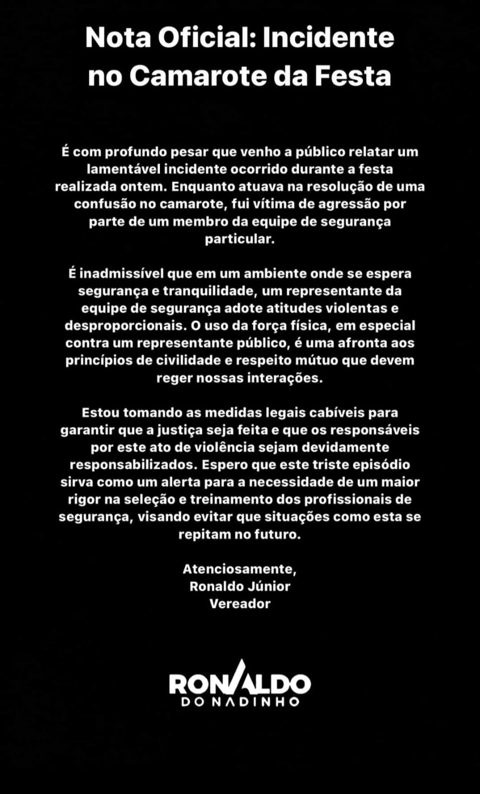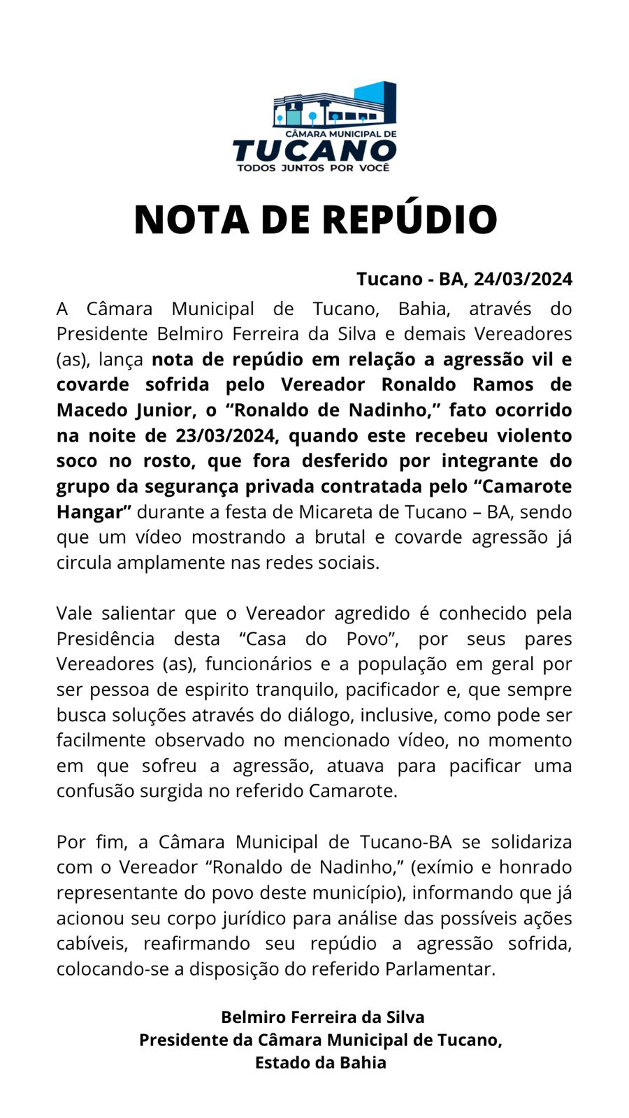 A equipe Cabral Segurança vem por meio desta nota esclarecer que não tem qualquer envolvimento com a agressão sofrida pelo Vereador Ronaldo. Nossa equipe prima pela segurança e repudia veementemente qualquer tipo de agressão.