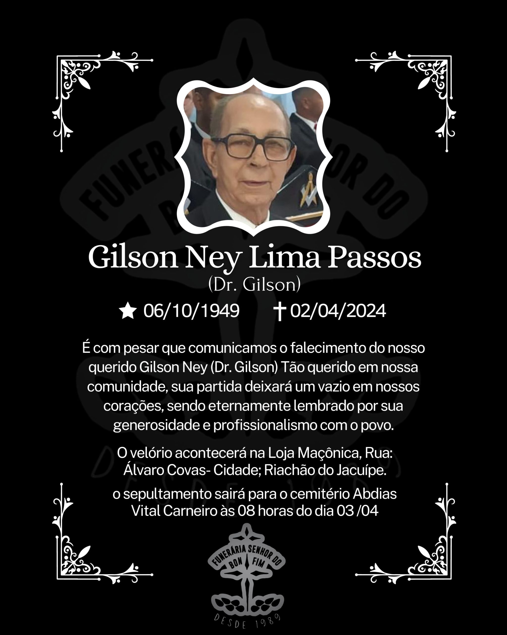 Morreu na madrugada desta terça-feira, 02, no Hospital da Bahia, em Salvador, o médico e ex-vice-prefeito de Riachão do Jacuípe Gilson Ney Lima Passos, aos 74 anos. Ele vinha se tratando de problemas na próstata, mas não resistiu as complicações e o óbito foi anunciado por volta das 03h30.