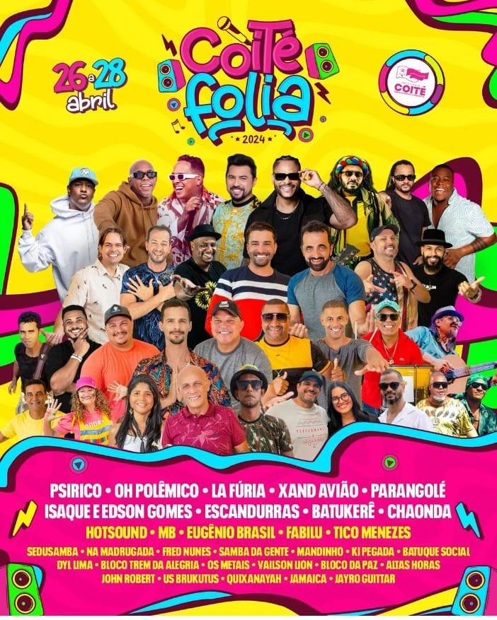 A Prefeitura de Conceição do Coité na gestão Marcelo Araújo (União Brasil) vai realizar no fim deste mês, de 26 a 28 mais uma Coité Folia, a terceira em quatro anos, não aconteceu a primeira porque estava em plena pandemia do novo Coronavírus, em 2022 foi realizada quando o vírus não era tão letal e o prefeito optou por realizar um pouco mais a frente, mês de setembro, e, após fechada a grade de atrações principais, não tinha nenhuma voz feminina, o Calila Notícias inclusive fez uma reportagem sobre a ausência de uma representante feminina entre as quarenta atrações do total, incluindo de bandas regionais e locais. Veja o cartaz no fim desta reportagem