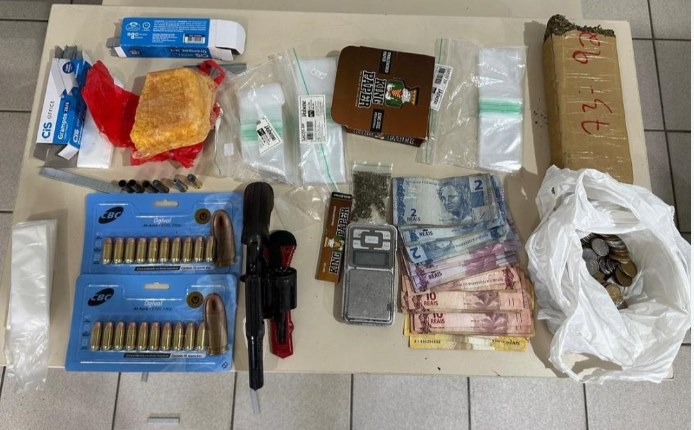 Os policiais apreenderam um revólver calibre 38, 20 munições calibre 45, um tablete e duas porções de maconha, meio tablete de crack, uma balança de precisão e diversas embalagens comumente utilizadas no fracionamento e comercialização de entorpecentes.
