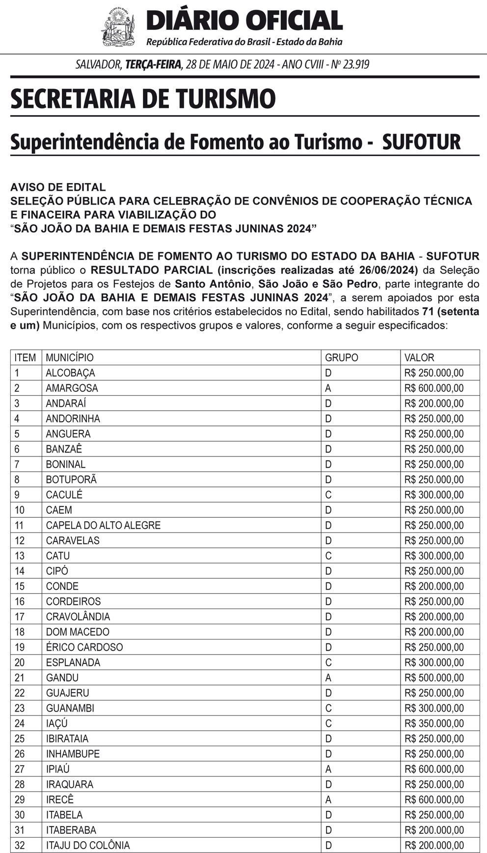 Foi divulgado no Diário Oficial do Estado da última terça-feira, 28, o aviso de Edital – Seleção Pública através da Superintendencia de Fomento ao Turismo (SUFOTUR) para celebração de convènios de cooperação técnica e finaceira para viabilização do São João da Bahia e demais festas juninas 2024″, tornando público o resultado parcial da seleção de projetos para os festejos de Santo Antônio, São João e São Pedro, a serem apoiados pela referida Superintendência com base nos critérios estabelecidos no Edital, sendo habilitados 71 municípios com os respectivos grupos [A,B,C,D,E].