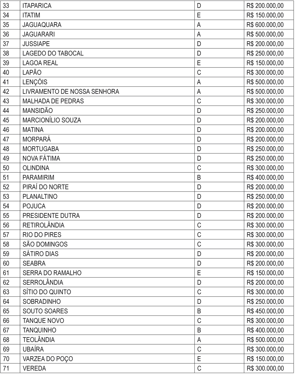 Retirolândia R$ 300 mil, Nova Fátima R$ 250 mil.