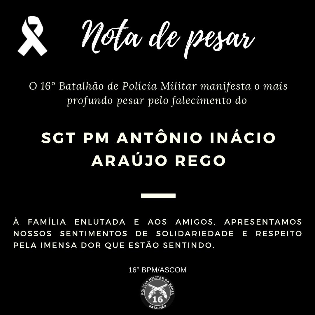 Através de nota, o 16º Batalhão da PM, lamentou pelo falecimento do sargento. “O 16º Batalhão de Polícia Militar manifesta o mais profundo pesar pelo falecimento do SGT PM ANTÔNIO INÁCIO ARAÚJO REGO.