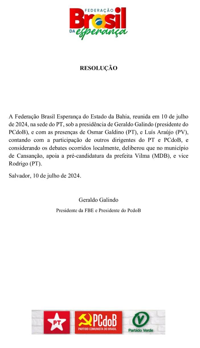 O Calila Notícias recebeu uma resolução de uma liderança do grupo da prefeita onde a Federação Brasil da Esperança formada pelo PT, PCdoB e PV deliberou que no município de Cansanção, apoia a pré-candidatura de Vilma e Rodrigo, assim sendo, anula completamente a chance de Ari de Almerindo concorrer a eleição de 6 de outubro, ao menos que ele opte por buscar uma vaga de vereador pela coligação encabeçada pela principal rival política.
