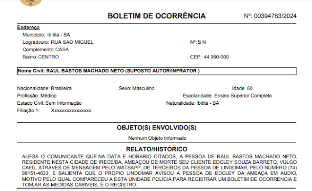 O parlamentar, que exerce o primeiro mandato na Assembleia Legislativa da Bahia (AL-BA) e ex-prefeito de Ibititá, foi ameaçado de morte pelo médico Raul Machado. Conforme o Boletim de Ocorrência registrado na 1ª Delegacia Territorial de Irecê, no último dia 12 de junho, o médico estaria cobrando valores indevidos relacionados a procedimentos hospitalares. Em nota enviada à imprensa, no entanto, o deputado negou a contratação de quaisquer serviços com o profissional.
