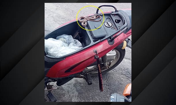 Um homem levou um tremendo susto no início da tarde desta segunda-feira, 08, quando abriu o bagageiro da moto para pegar a carteira em frente a uma farmácia no centro de Riachão do Jacuípe e deparou com uma cobra.